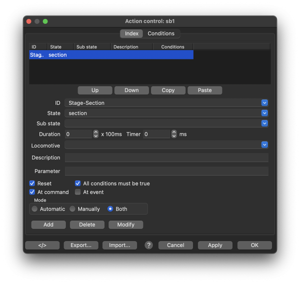 Action controls trigger actions when the states of Rocrail objects change. An action control is therefore not part of an action but can control one. An action control is part of the object that is used to trigger the action (eg sensor, switch, route)