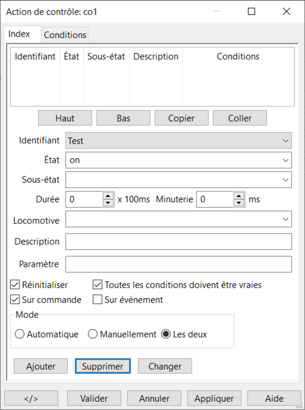 | System | go-cmd, go-event, stop-cmd, stop-event, stoplocs, save, shutdown, analyse, reset, ebreak, init, initready, short-circuit, on-auto, off-auto, stagetimeout, stagetimeoutreset, exception-xxxx, Expiration de l'évènement, eventtimeoutreset, error | Actions système se trouvent dans la menu objets Rocview L'événement init est enclenché après que toutes les bibliothèques de la station de commande aient été chargées. Pour le traitement exception-xxxx Vérifier les actions de suivi doit être activée sur l'onglet Automatique de Rocrail. | |