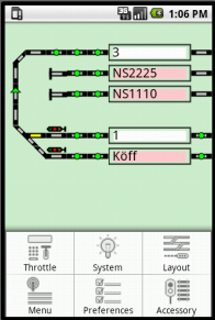 Toucher la photo de la locomotive fera défiler l'activité manette, Locomotive et Configuration de la locomotive.