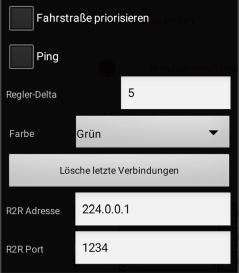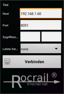 Mit dem Start von andRoc wird der Verbindungs-Dialog geöffnet. Findet R2RNet einen Rocrail-Server, wird das im ersten Feld angezeigt.