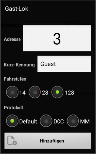 Standardeinstellung ist DCC und 128 Geschwindigkeitsstufen, wenn nur die Adresse gesetzt wird. In diesem Fall ist die Lok-Kennung gleich der Adresse.