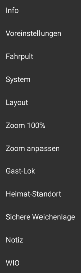 Das Hauptmenü kann durch einen Klick auf die drei Punkte in der oberen rechten Ecke des Gleisplans geöffnet werden.