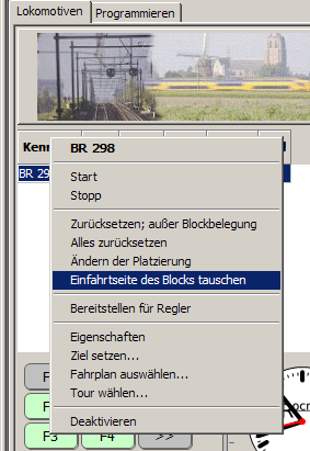 Sollte der Richtungspfeil nun nicht in die gewünschte Fahrtrichtung zeigen, so muss die Lok in der Spalte Kennung mit der rechten Maustaste angeklickt werden und Einfahrtseite des Blocks tauschen ausgewählt werden: