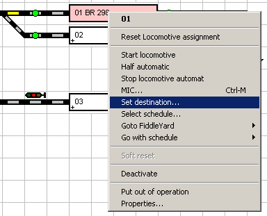 A loco, alternatively, can be started from the context menu of a block: A right click is performed on the block symbol of block where the loco currently waits and Set destination… is selected: