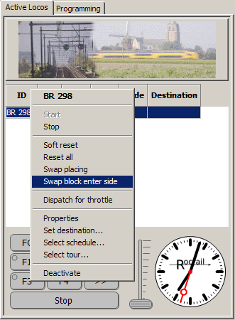 Single locos, additionally, can be stopped by selecting Stop locomotive automat from the context menu of a block the loco occupies or has reserved (block colours red, blue or yellow).
