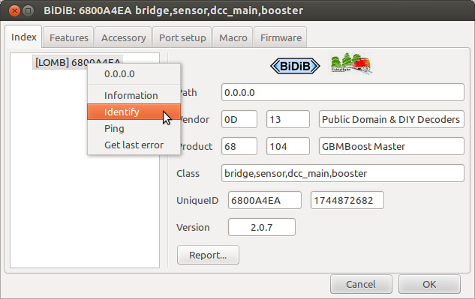 All BiDiB hardware modules have an identify button. If this button has been pushed the this dialog will pop up.