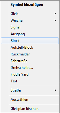 Dann kann mit einem rechtem Mausklick an einer Rasterposition des Plans mit diesem Kontextmenu ein neuer Block platziert werden: