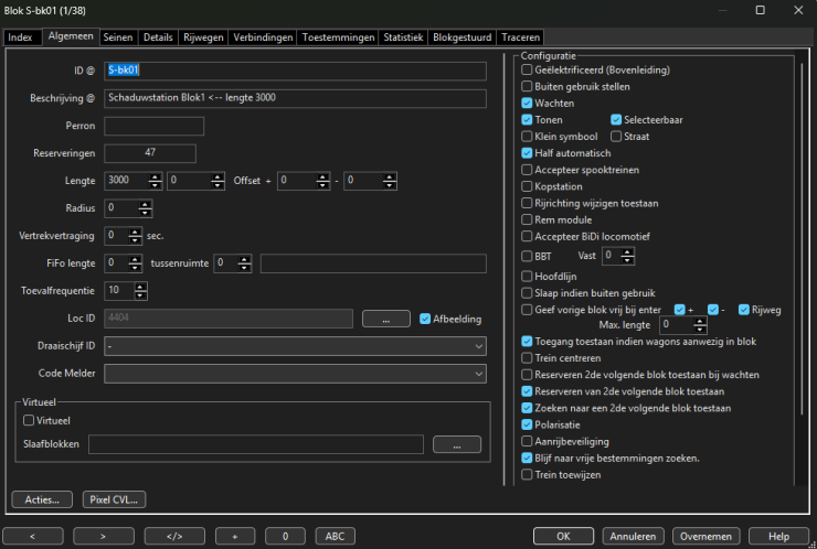 De ID's wordt gebruikt door het gehele Rocrail programma als unieke sleutel om te verwijzen naar dit blok en is daarom van groot belang.