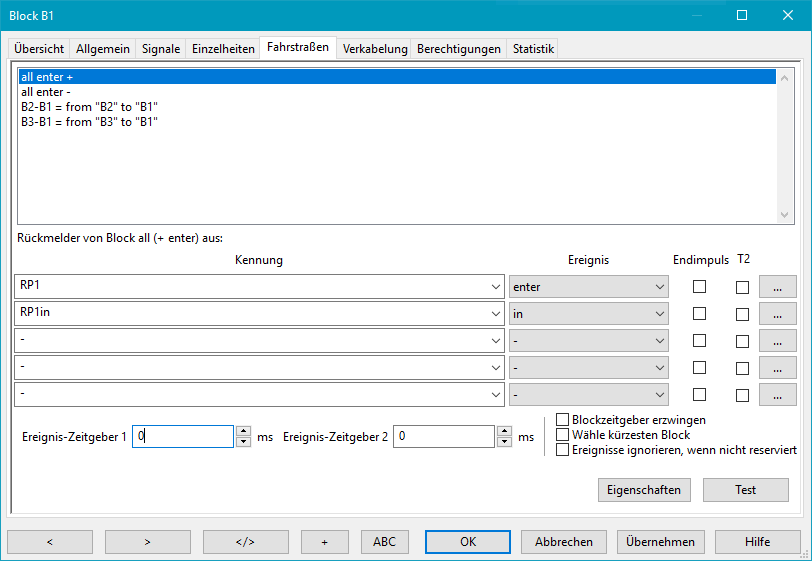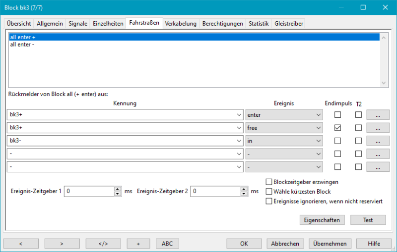 Die Einträge der Rückmelder mit Ereignissen bei all enter + und all enter - sind eine allgemeine Zuordnung für alle Fahrstraßen,