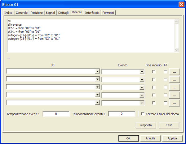 Per ogni itinerario la casella T2 determina se viene usato il temporizzatore 1 (T2 non selezionato) o il temporizzatore 2 (T2 selezionato). La casella di selezione viene considerata solo quando l'evento è di tipo enter2in, enter2pre o in. L'evento in non viene considerato quando proviene da un sensore reale oppure quando è generato da un sensore è ritardato dal temporizzatore evento selezionato. Il valore dei temporizzatori evento è espresso in millisecondi.