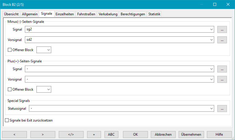 Alle vorhandenen Signale, die mit dem Block verknüpft werden sollen, werden mit Hilfe der Auswahlfelder für die jeweilige Blockseite festgelegt.