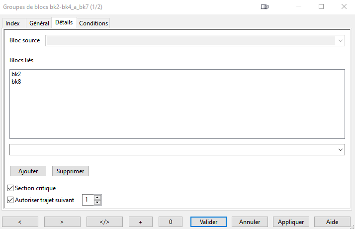 Cette option active l'utilisation d'un groupe de blocs. En choisissant section critique , chaque fois qu'un train veut réserver un bloc, le programme vérifiera si ce bloc appartient à un groupe. Il bloquera l'ensemble du groupe pour ce train et évitera ainsi de se trouver dans une impasse, où par exemple deux trains se retrouveraient face à face, en sens inverse et devant emprunter le même bloc.