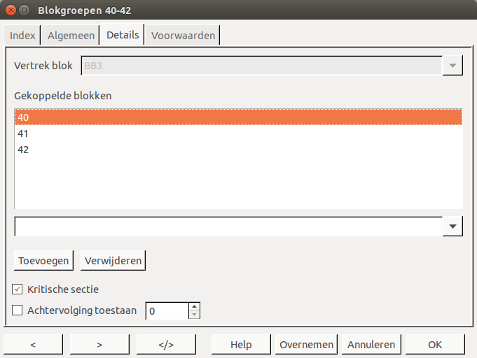 Het tweede veld geeft aan hoeveel extra treinen mogen volgen. De standaard waarde 0 betekent hier dat er oneindig veel treinen mogen volgen.