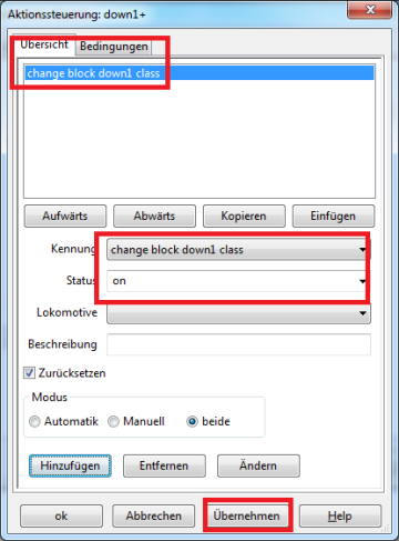 So when we start now the automatic and start all trains, the change is 50:50 weather a train goes to the upper road (via block up1) or to the down road (via block down1).