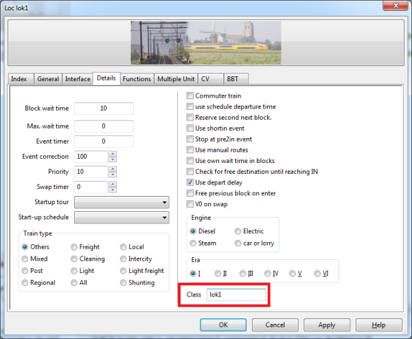 We go in the train database and set for lok1 under properties-details the class 'lok1' (see pic below):
