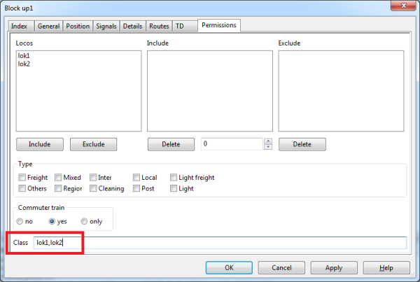 lok1 can now only choose the upper road (via block up1), because this is the only block, where the class lok1 is allowed!
