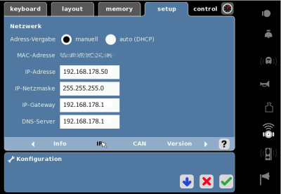 On tab setup of the CS2 the wrench symbol is selected in order to be able to change values. In section IP it has to be chosen whether IP-adresses are assigned automatically by a DHCP-server in the network or if they are set-up manually.