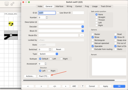 | For a Rocrail output the "accessory-120" is used as a CTC-Module. Open the output properties and then open the "Pixel CTC…" properties and configure it equivalent to this: |
