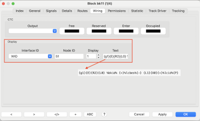 Le contenu de l'affichage TCO est configuré par le bloc Rocrail. Configurez les valeurs de l'onglet "Câblage" comme suit: