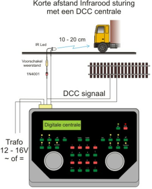 De vraag kan natuurlijk zijn of we wel een continue bereik nodig hebben en of we dat wel willen. Door op strategische plaatsen een korte afstand IR LED te plaatsen kunnen we binnen het bereik van de LED iedere auto aansturen. Bijvoorbeeld voor kruizingen, splitsingen of zebrapaden. Het leuke is dat alle mogelijkheden van besturen door elkaar gebruikt kunnen worden. De commando’s van de functiebouwsteen, die ook volgens de korte afstand infrarood methode werkt, kunnen dus prima samen gecombineerd worden met de DCC centrale sturing.