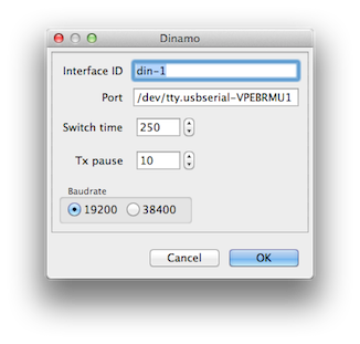 The default is 19200 which can be change by option "S1 38k4" on the interface to 38400; Check the "DinamoConfig" manual.