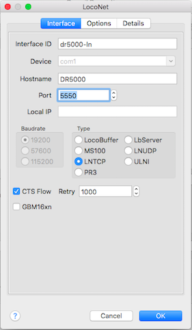 | LocoNet, LNTCP, is recommended for the DR5000 communication. |
