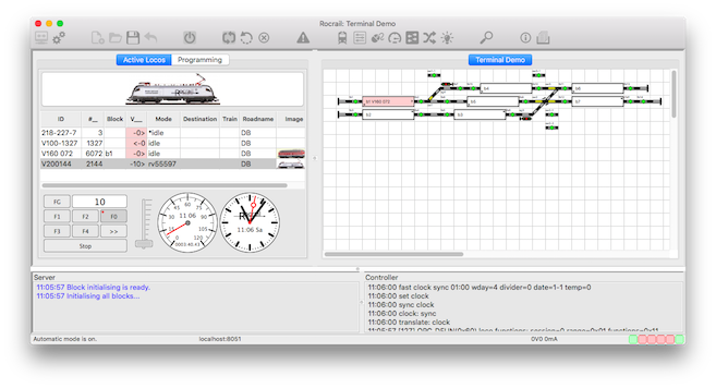By creating a layout with Sensors, Blocks, and Routes, and then assigning your Locomotives to the Blocks, Rocrail can move the Locomotives by itself. You can use Schedules and Critical Sections to create and fine-tune complex movements for each Locomotive.