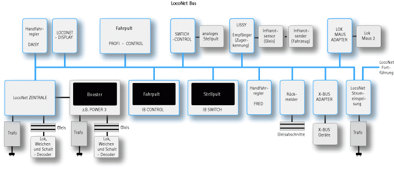 - Zentralen | Schnittstellen | LocoNet-Uhr | Handregler | Transponding | Option Switches | Verkabelung