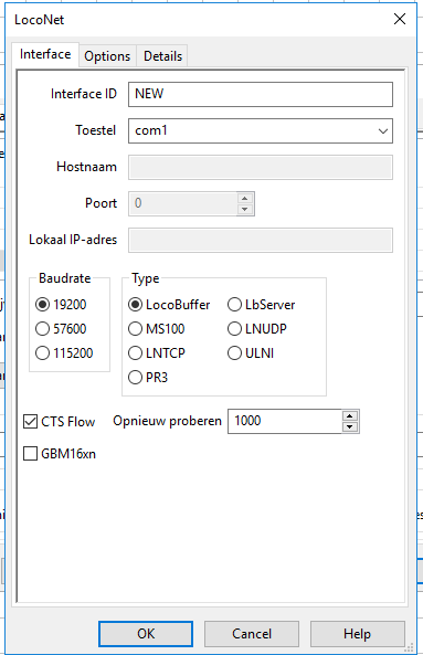 Vervolgens kan de centrale IB worden bewerkt in de tab Eigenschappen. Er opent een dialoog-menu Loconet Interface: