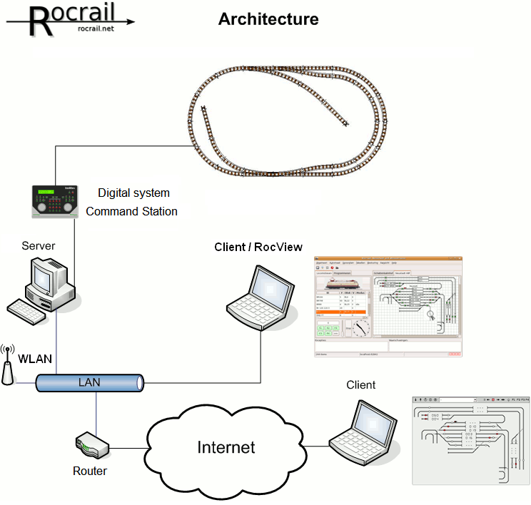 Rocrail uses 2 main programs, a Server and a Client. These programs work with each other using Internet protocols, and do not need to be on the same computer. You can use Rocrail from a single computer connected directly to your layout, and you can also control your layout from any computer on your home network, or over the Internet. Rocrail also has a web interface, which will let you run the layout from a web browser such as Firefox.