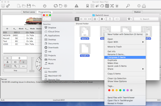 Wenn ein Problem im Rocrail Forum gemeldet wird, müssen einige wesentliche Dateien mitgeliefert werden, die mit dieser Funktion einfach in ein paar Schritten zusammengestellt werden können: