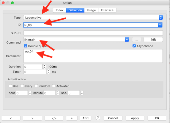 The Rocrail plan does include the XML-coded examples for "consist", "assigntrain" and "linktrain".