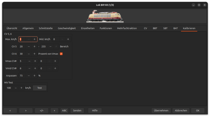 - Übersicht | Allgemein | Schnittstelle | Geschwindigkeit | Einzelheiten | Funktionen | Mehrfachtraktion | CV | BBT | SBT | BAT | Kalibrieren | Wartung | Rangiermodus