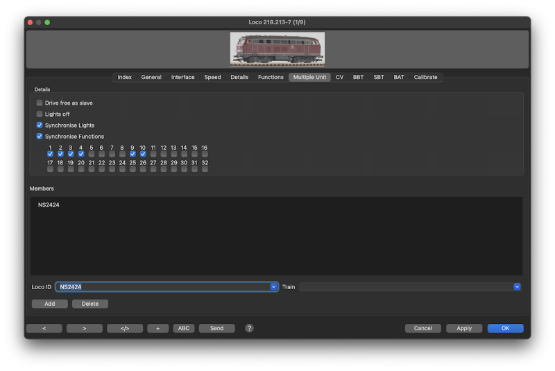 The Multiple Units page makes it possible to create a consist of locomotives with this locomotive as master.