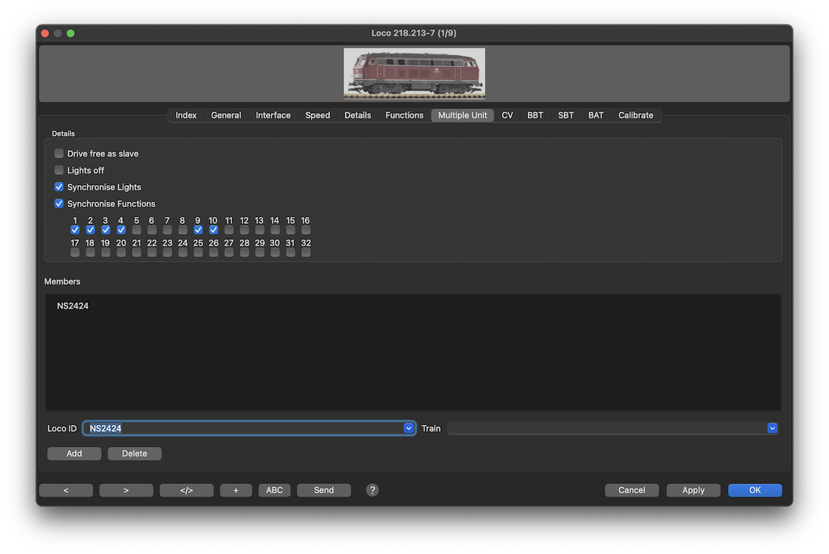 Op dit tabblad is het mogelijk een groep loks te formeren die in multi tractie gaan rijden. Alle commando's verzonden naar de eerste lok en zullen ook aan de andere loks gezonden worden. Let er wel op dat alle loks zo geprogrammeerd zijn dat ze in dezelfde snelheidstrap ook dezelfde snelheid rijden. Pas zonodig de CV's aan.