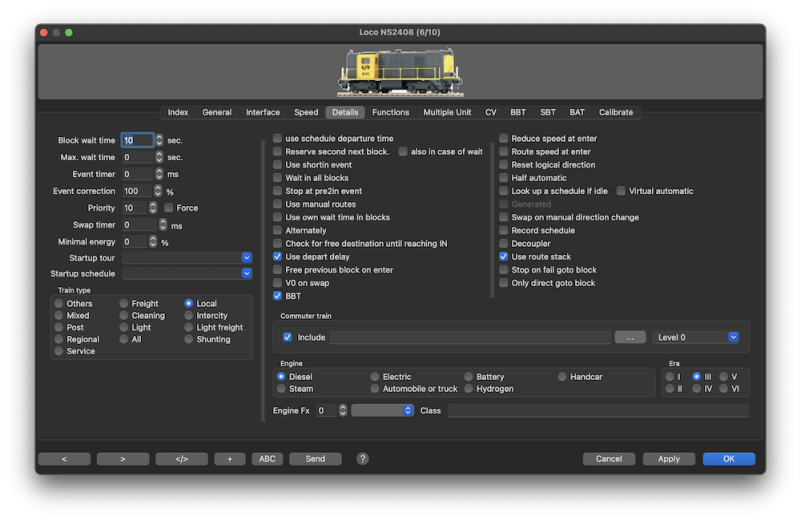 - Index | General | Interface | Speed | Details | Functions | Multiple Units | CV's | BBT | SBT | BAT | Calibrate | Maintenance | Shunting Mode