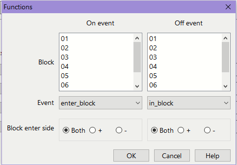 The events enter, in, exit known from Sensors and Blocks can be used to trigger a function on or off. In addition, run and stall can be used to trigger a function on or off depending on the loco running (speed step >0) or not (speed step =0).