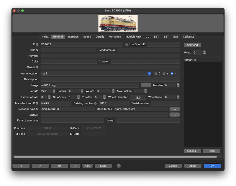 Aucun Bloc ne fera de vérification si ce champ est laissé à zéro. Cependant, afin d'éviter de faire rouler un train dans un Bloc trop court, il serait sage de définir la valeur réelle de la longueur et d'également la définir dans le champ longueur de tous les Blocs.. La mesure, cm or inch, dépend de votre choix. Assurez-vous d'utiliser la même dans les propriétés des Blocs. Longueur = Locomotive plus tous les wagons.