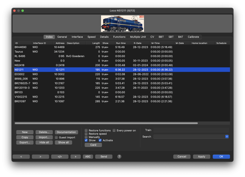 - Index | General | Interface | Speed | Details | Functions | Multiple Units | CV's | BBT | SBT | BAT | Calibrate | Maintenance | Shunting Mode