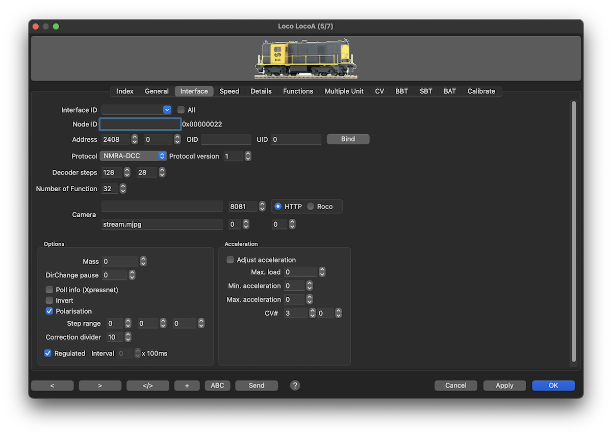 - Le nombre de crans de vitesse du décodeur de la station de commande et de Rocrail doit correspondre, sinon la lumière loco (FO) peut ne pas fonctionner correctement.