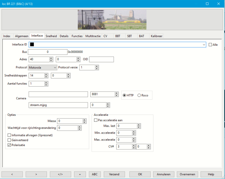 Als er meer dan één centrale wordt gebruikt, wordt in dit veld de centrale vermeld die verantwoordelijk is voor de aansturing van de locdecoder. Het veld "Interface ID" kan leeg blijven als het object is verbonden met de eerste centrale (eerste 'digint' in rocrail.ini) uit de lijst met centrales.