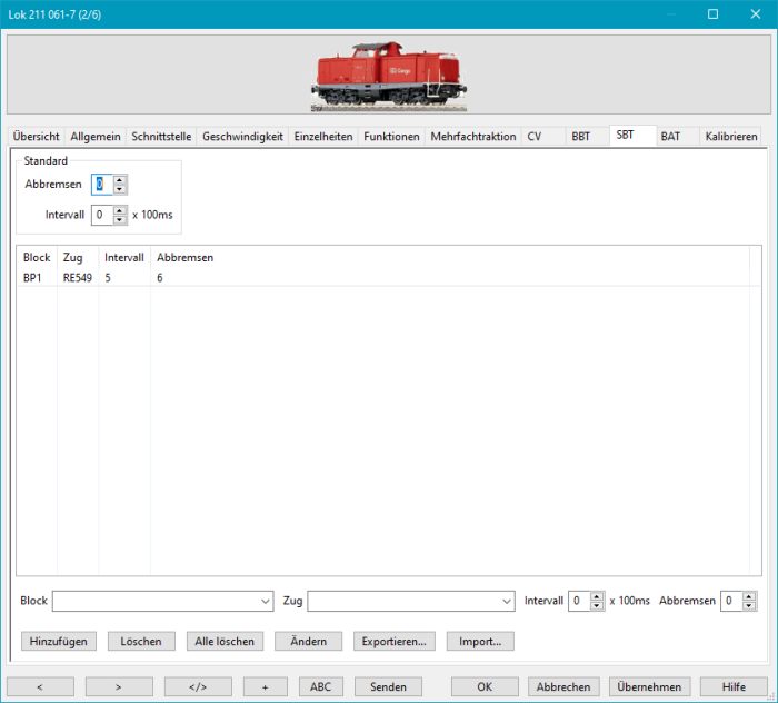 - Übersicht | Allgemein | Schnittstelle | Geschwindigkeit | Einzelheiten | Funktionen | Mehrfachtraktion | CV | BBT | SBT | BAT | Kalibrieren | Wartung | Rangiermodus