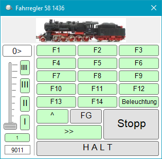 Die Schaltflächen stellen die in den Lok-Eigenschaften definierten Geschwindigkeiten ein.