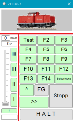 Si la locomotive fonctionne en mode automatique cela activera la pause qui rejettera toutes les futures commandes de vitesse. Cela est rendu visible avec le point rouge dans le coin supérieur gauche de ce bouton.