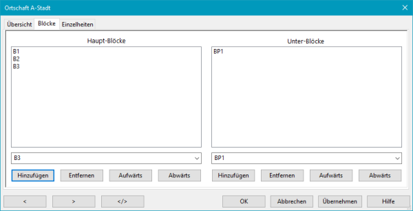 Mit den Listen sind die Blöcke der ausgewählten Ortschaft zugeordnet.