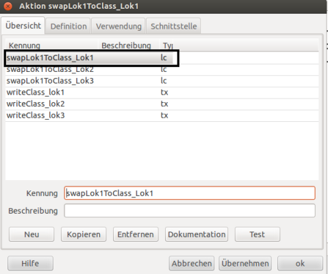 Es wird in diesem Beispiel nur die Lokomotive lok1 Verwendung finden. Daher bietet es sich an, auch für Übungszwecke, die Schritte auf dem eigenen System für lok2 selbst nachzuvollziehen. Am Beispiel der Aktion 'swapLok1ToClass_Lok1' wird aufgezeigt, wie das funktioniert.