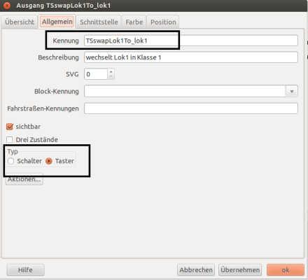 Im Feld Typ wird dieser Ausgang als Taster konfiguriert. Die so angelegten Taster werden z.B. unterhalb des Gleisplanes angeordnet. Diese Taster könnten jetzt mit einem Textfeld, welches als Bezeichner dient, beschriftet werden. Im Übungsplan ist dies bereits geschehen.