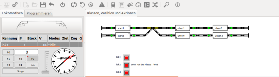 In diesem Beispiel geht es darum, Lokomotiv-Klassen zu benutzen. Dazu wird das Szenario aus dem Artikel Block-Zufallsrate und Klassen um Variablen und Aktionen erweitert.