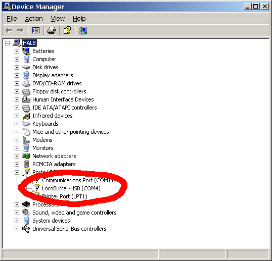 Unter Windows muss der richtige Treiber für den LocoBuffer installiert sein. Wenn das erledigt ist, muss der COM-Port bekannt sein, den er verwendet. Diese Information ist unter Start → Systemsteuerung → System → Gerätemanager zu finden: