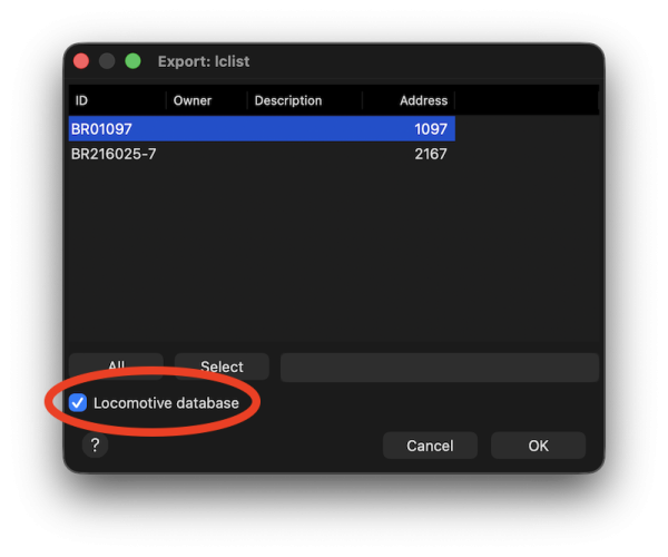 Avec l'option "Base de donnée locomotive" l'exportation des locomotives sélectionnées sera dans LocoDB.